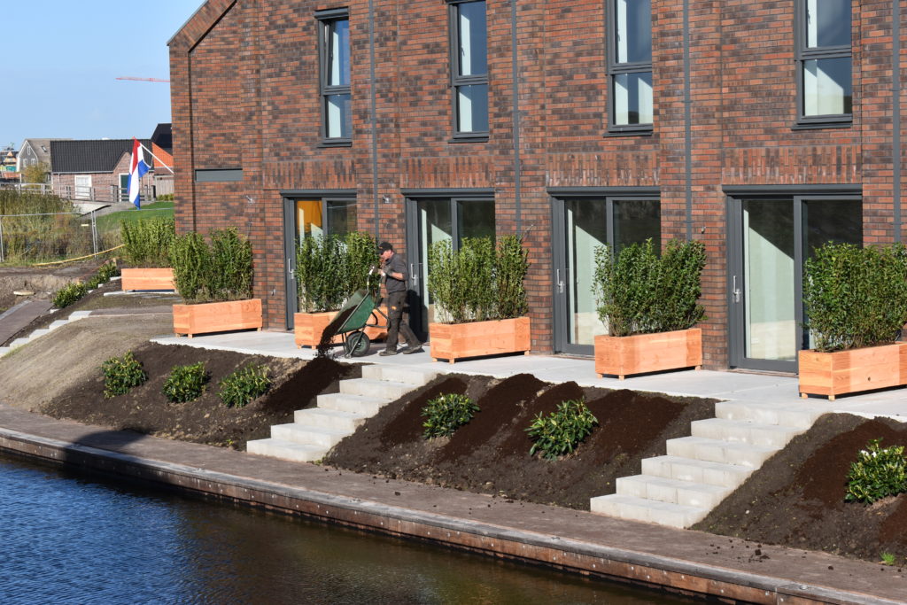 Zoals op de foto’s te zien is hebben wij aan de kade aan de achterzijde van de nieuwe woningen Rododendrons geplant.