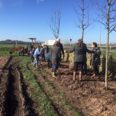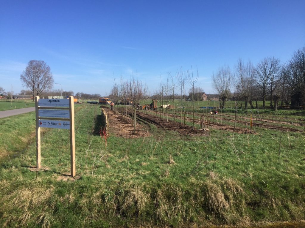 Medewerkers van De Ridder boden een helpende hand. Alle bomen zijn gericht op permacultuur en daarom zijn er veel fruitbomen geplaatst. Ze staan hier nog niet op hun definitieve plek maar in een ‘logeertuin’. Uiteindelijk worden zij op hun vaste plek geplaatst in Tuindorp Laakzijde, als het terrein daarvoor gereed is.