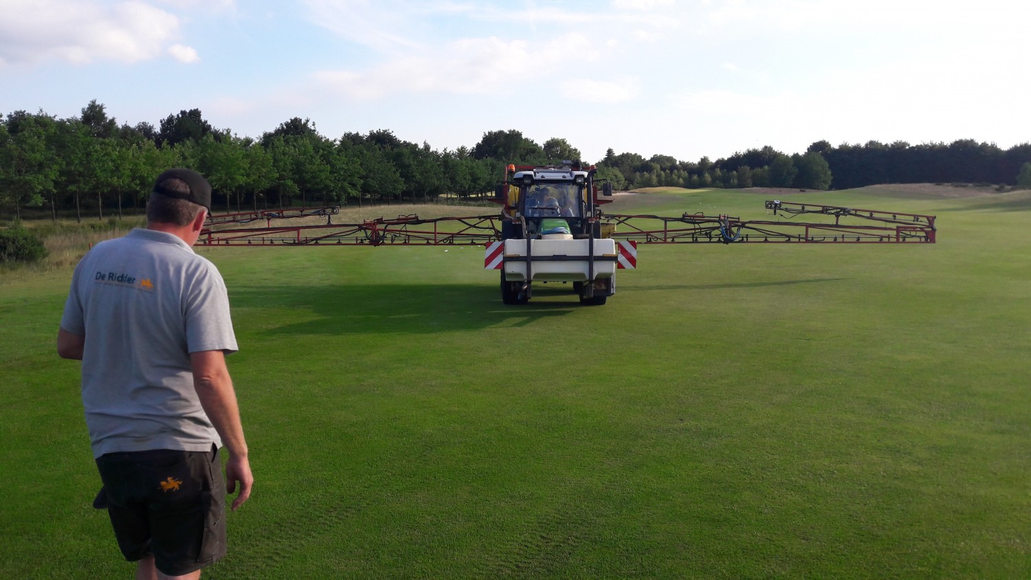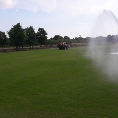 Voordat overgegaan kan worden tot het daadwerkelijk toepassen van de nematoden dient de bodem goed te worden voorbereid. Gerard: ‘Na het waarnemen van de eerste vluchten kevers zijn we al begonnen met de voorbereidingen op de golfbaan, zoals het op peil houden van het juiste bodemvochtgehalte. Een luchtige toplaag, bijvoorbeeld bewerkt met een vertidrain, bevordert de effectiviteit. Wij hebben ook een wetting agent toegepast om de waterverdeling in de toplaag te optimaliseren. In totaal behandelen we 11 ha, dus dat is een flinke operatie.’
