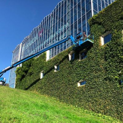 De Ridder zoekt het hogerop bij het snoeien van de klimop bij Prenatal in Amersfoort