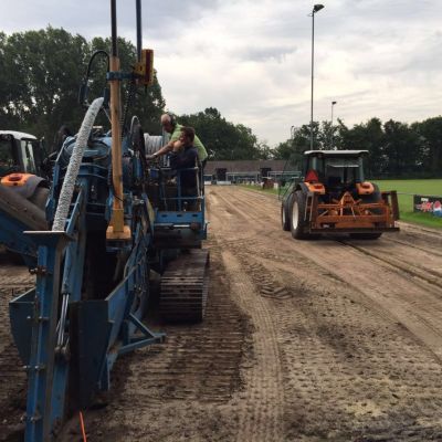 Op dit hoofdveld wordt namelijk drainage toegepast en het veld wordt opnieuw geëgaliseerd en ingezaaid. Volgende week gaan we verder met de werkzaamheden.