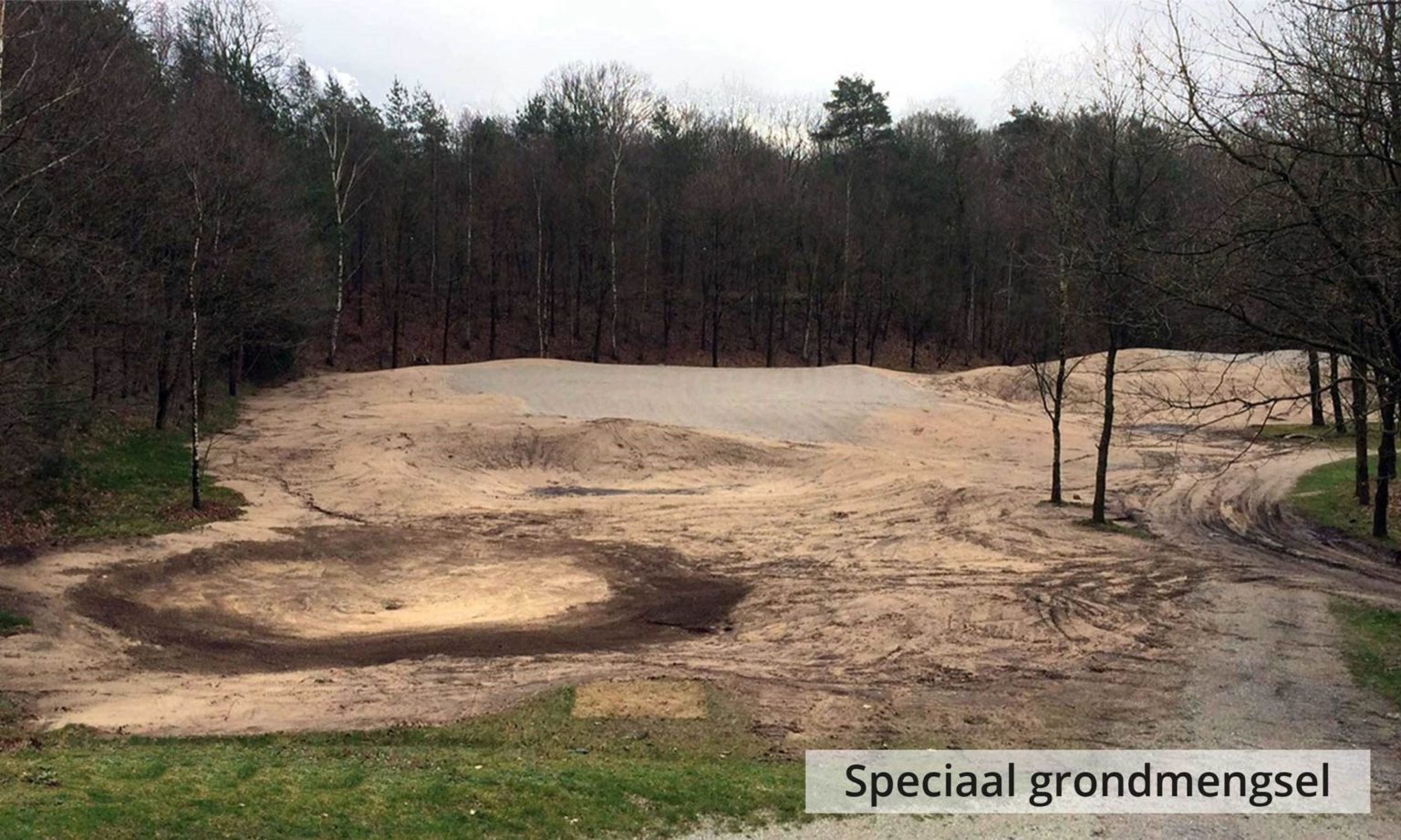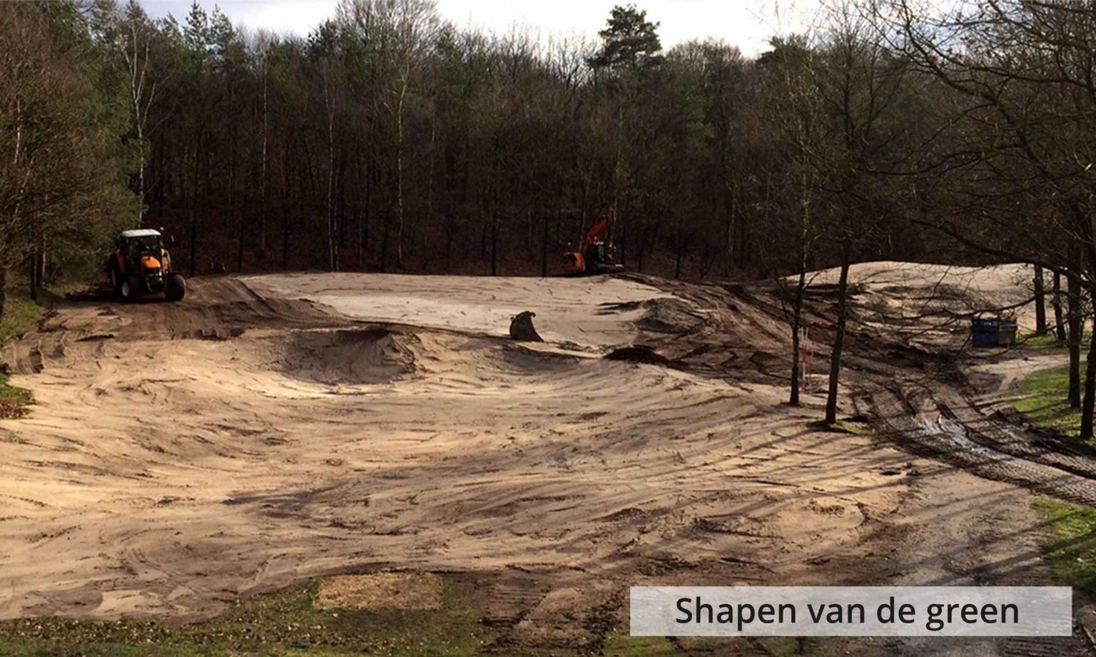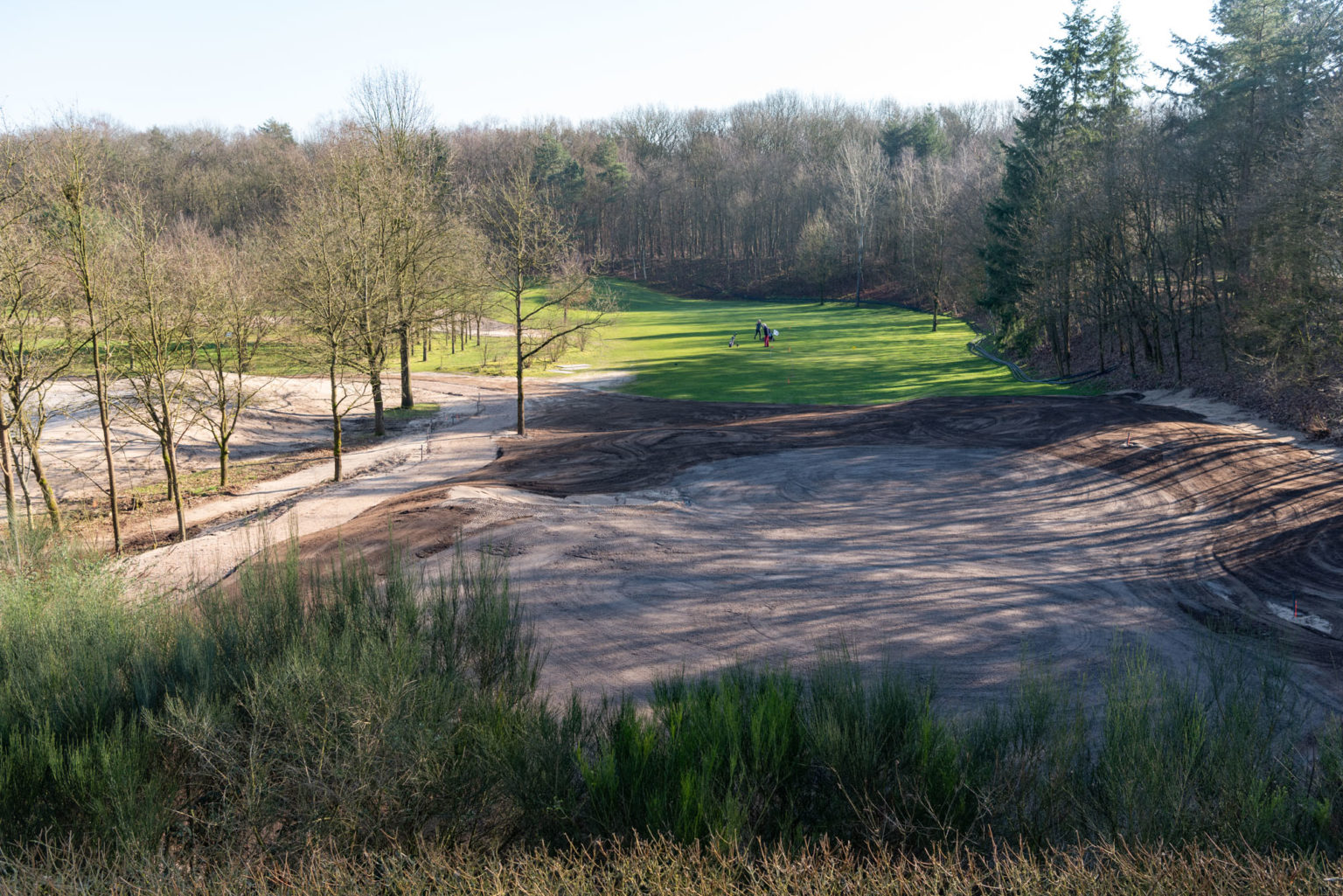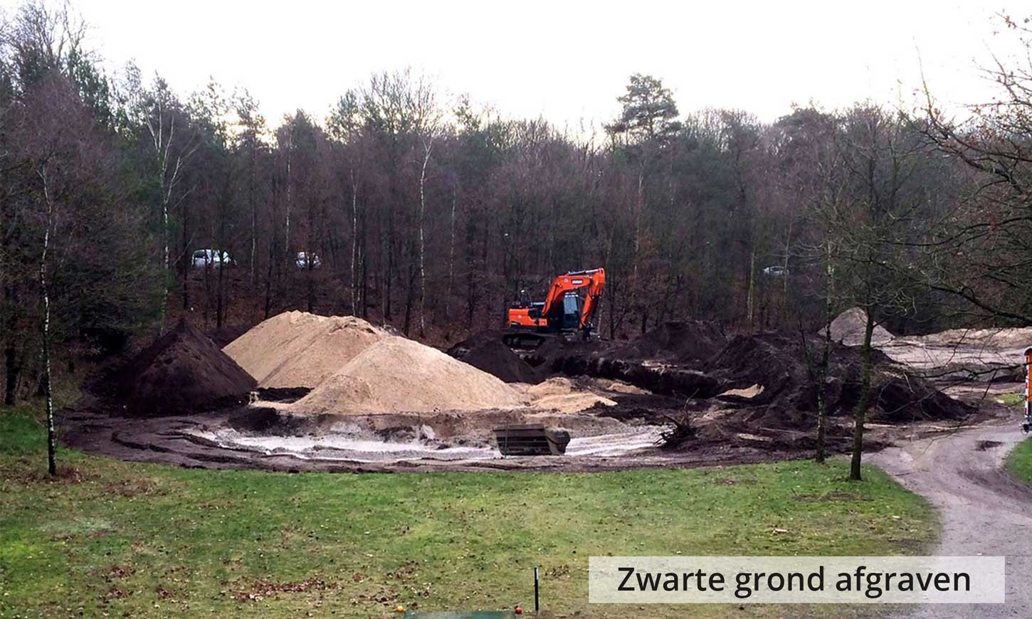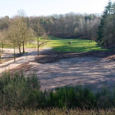 Wij zijn met zwaar grondverzet begonnen door de vette bovenlaag te begraven op ruim een meter diepte, waar mooi zand aanwezig was. Zodoende hebben wij een waterdoorlatende laag van een meter zand gecreëerd wat zorgt voor een betere absorptie en waterafvoer op de greens.