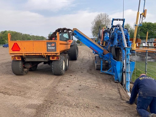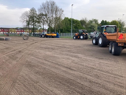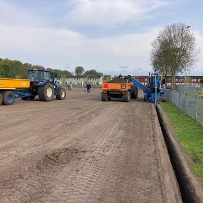 Renovatie veld 2 van voetbalvereniging S.C. Buitenboys, Almere. De werkzaamheden voor het aanleggen van drainage en beregening is begonnen.